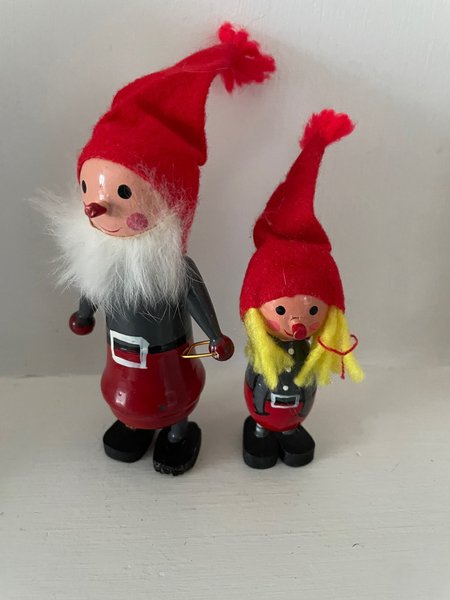 Två söta trätomtar med röda hattar. Den större tomten har ett vitt skägg och den mindre har gult hår.