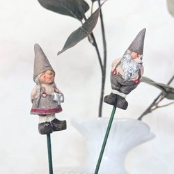Säljer ett set med två söta tomtar. Perfekt för att dekorera julen. Den ena tomten håller en kvast och den andra en kärve. 17 och 15 cm höga.