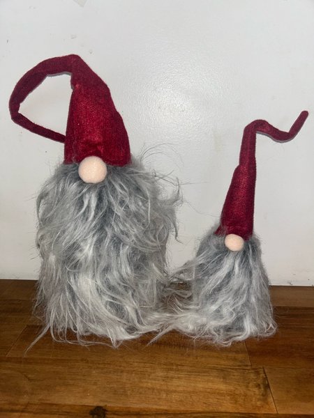 Två söta tomtar med gråa skägg och röda hattar, 26 cm och 13 cm höga, utan luvan. Tomtarna är som nya.