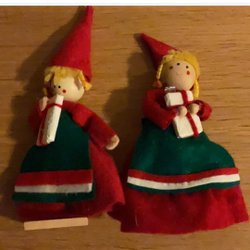Två söta tomtar med gråa skägg och röda hattar, 26 cm och 13 cm höga, utan luvan. Tomtarna är som nya.