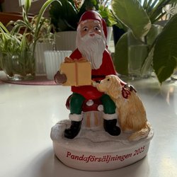 En söt handgjord tomte med röd luva, vitt skägg, turkosa byxor, bruna skor och söta små glasögon. Tomten har en liten säck på ryggen. Den är välvårdad och är gamla ifrån min farmors tid