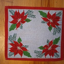 Tryckt julduk med motiv av svampar och bär.. Duken är av bomull. Den är ca 26 cm x 25 cm. Den är i fint skick, men finns några mörka prickar..