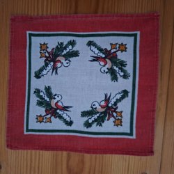 Julduk med tryckt motiv. Den ser ut som linne, men känns mer som polyester. Den är ca 77 cm x 41 cm. Den är i mycket bra skick.