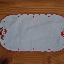 Broderad julduk. Den är broderad i rött på linne med en röd kvadrat i mitten och fodrad med rött på baksidan. Den är ca 39 cm x 39 cm. Den är i bra skick, men inte perfekt.