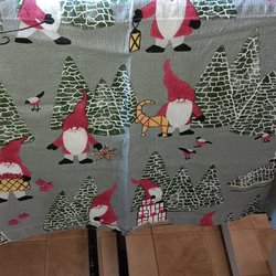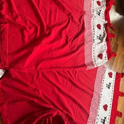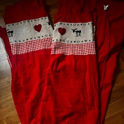 Julgardin i mörkrött med insydd spets. Det är två längder. Längderna är ca 226 cm höga plus knytbanden för upphängning x 121 cm breda. De har oxå ett upplägg på 20 cm. De är i 100 % bomull. De är i fint skick.