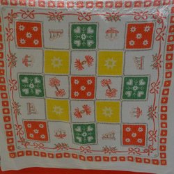 Tryckt julduk 85 x 84 cm med rutmönster, tryckt på tyg med invävt mönster. Vikt ca 180 g. Detta är ett välkänt motiv, vi har haft och har säkert fortfarande någon duk med samma motiv i gömmorna.