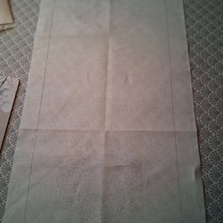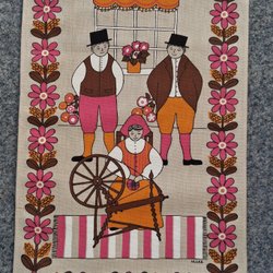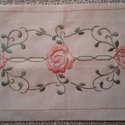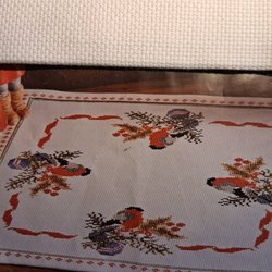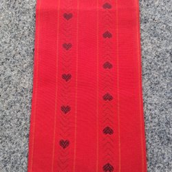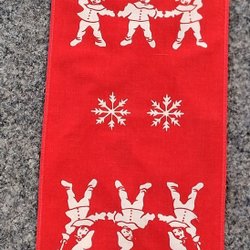 En vacker julduk med broderade julblommor och texten "God Jul". Broderad på bomull kantad med rött band