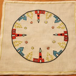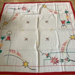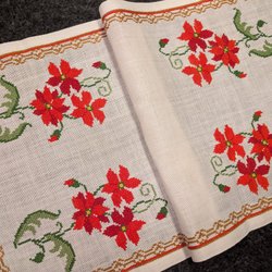 Vackert korsstygnsbroderad linneduk, jul duk i blått och rött