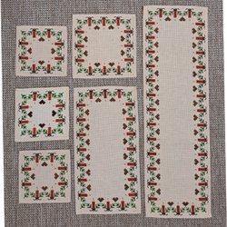 Två fina juldukat med broderat julmotiv, hjärtan och grankvistar i rött, gult, grått och silver på grön aidaväv. Snygg avslutning i efterstygn. En större 35 x 38 cm och en mindre 28,5 x 30 cm.