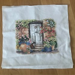 En charmig broderad julbonad med motiv av tomtar, ljusstake och kittel. Perfekt för att skapa en mysig julstämning i hemmet. Mått: 63cm x 36cm.