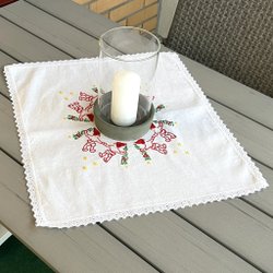 En vacker broderad duk med julmotiv i milda färger. Handbroderat motiv av tända juleljus, blommor och domherrar på vit linneväv. Handfållad. Storlek: ca 36 x 37 cm. Baksidan syns på sista bilden. Inga fläckar eller skador.