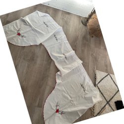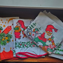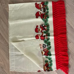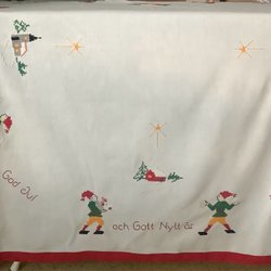 Gardinkappa med julmotiv. Tomtenissar med grötfat, julbock och gran. Den är 215 cm lång och 54cm bred. Fint begagnat skick. Klicka på första bilden så syns nästan hela kappan.
