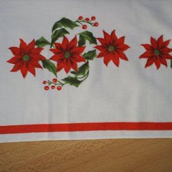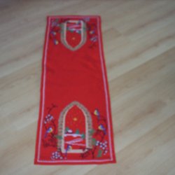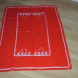 Ny, julgardin med tomtar och lucior. Stl. 244*46,5 cm, har aldrig varit upphängd. Men, jag såg en liten "fläck", se bild 3, man tänker nog inte på det när gardinen är upphängd.