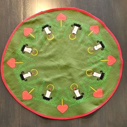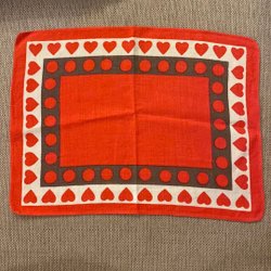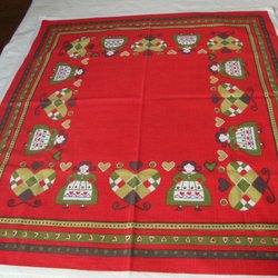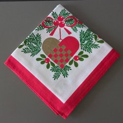 Retro julduk med ett tryckt motiv av en ram med hjärtan, gröna blad och röda bär. Perfekt för att skapa julstämning.