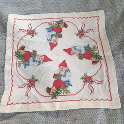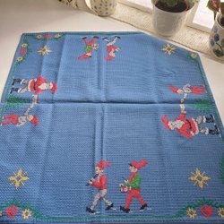 En fin julduk med broderade tomtar och stjärnfall. Duken har en röd kant. Storlek 80x77cm