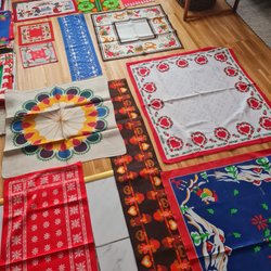 Ett sortiment av vintage jultextilier. Inkluderar dukar och löpare med julmotiv som tomtar, hjärtan och traditionella julmönster. Perfekt för att skapa en stämningsfull juldukning.
