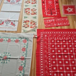 Ett sortiment av vintage jultextilier. Inkluderar dukar och löpare med julmotiv som tomtar, hjärtan och traditionella julmönster. Perfekt för att skapa en stämningsfull juldukning.