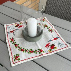 Handbroderad äldre julduk med röda ljus och blå bakgrund jul julpynt julsaker