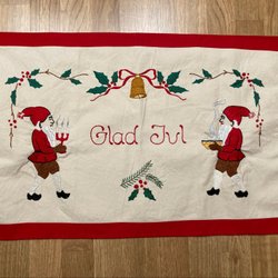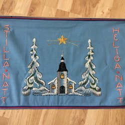 Handbroderad julbonad med texten ”Jul jul strålande jul, sänk dina vita vingar”. Välgjort hantverk!