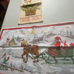 Den broderade är 37x19 cm. Ringar för upphängning. Gammal.