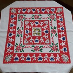 Paket med olika vackra Jultextilier. 8 st jultextilier: dukar, löpare och en julpost. Fyra handbroderade, två stora virkade, en vävd, en gammal tryckt. Alla i fint helt begagnat skick. Se bilder. Syna och förstora.