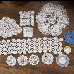 6 st små ”tavlor, 17x17 cm. Broderade av Sonja Pippi Melin. Som du ser på bilden så finns spår av klutt/häftmassa på baksidan.