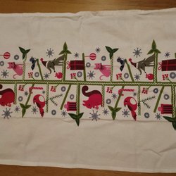 Liten röd julduk med ett mönster av blommor och guldiga ränder. 23 x 23 cm.
