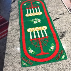 En fin retro julduk med en liten fläck och ett litet slitage på det vita . Har mycket kvar att ge , fläcken går säkert bort , men den är liten och smälter in bland stjärnorna . Mäter 74 x 72 cm .