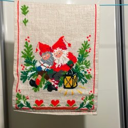 Röd julduk med tryck av tomtar, stjärnor och julmotiv. Perfekt för att skapa julstämning i hemmet.