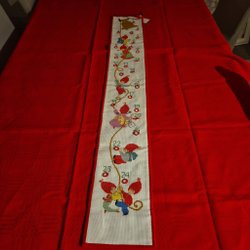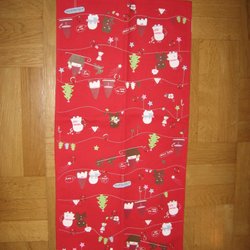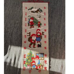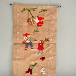 Julkalender i form av en strumpa. Med små fickor att antingen lägga små klappar i alternativt sätta fast med säkerhetsnål eller liknande. Ficka nummer 21 har lossnat lite, men lätt att sy fast igen. I övrigt I fint skick. Inga fläckar.