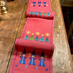 Vit julduk med broderier av julstjärnor, blad och stjärnfall. Duken har en röd kant.
