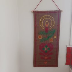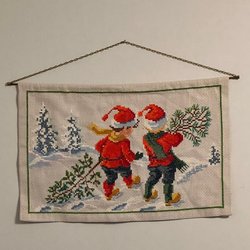 En charmig broderad julbonad med motiv av tomtar, julgranar och texten ”God Jul”. Perfekt för att skapa en mysig julstämning i hemmet. Mått: 65 x 36cm Fräsch och Fin till skick Köpare står för valfri frakt