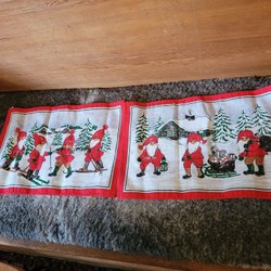 1 Vöggjulbonad o en löpare i rött med julmotiv. 80x13 broderad 100x30 tryck