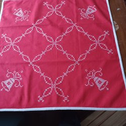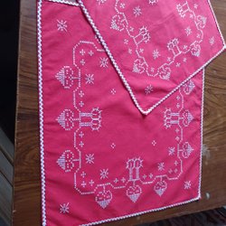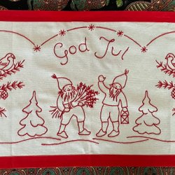 En charmig broderad julbonad med klassiska julmotiv. Perfekt för att skapa en mysig julstämning i hemmet.