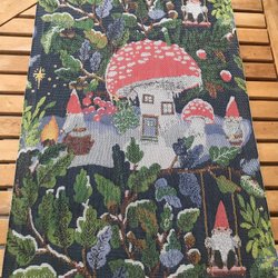 Retro! En vävd Bordslöpare/Väggbonad (gobeläng) med julmotiv.Mått: 36cmx103,5cm!Den har en bild av jultomten i sin släde som flyger över ett vinterlandskap. Perfekt för att skapa julstämning på bordet.Så Vacker! Fint Skick! Samfraktar!