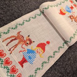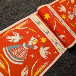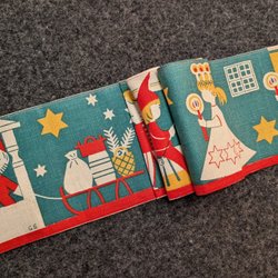 Vacker rödvit julduk med klassiskt svenskt motiv inspirerat av den välkända julsången “En sockerbagare här bor i staden”. Motivet visar sockerbagaren, pepparkaksgubbar, grisar, bockar och ett pepparkakshus – allt i en härligt nostalgisk stil. Perfekt till advent, lucia eller juldukningen. Duken är i mycket fint skick, inga anmärkningar. Tryckt på bomull. Tryck: “En sockerbagare här bor i staden”.