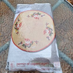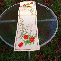 Vit julduk med broderade julstjärnor och gröna blad. Perfekt för att skapa julstämning i hemmet. Välbroderad på bomullstyg. Duken är nästan fyrkantig.