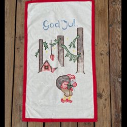 En charmig julbordslöpare med broderade tomtar och granar. Löparen har en virkad röd kant. Vikt ca 40 gram och kan skickas i ett plastkuvert för 24:-(porto plus emballage )