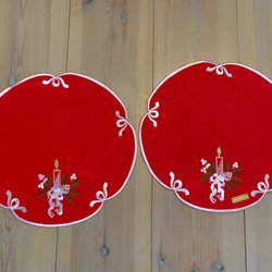 Vintage Två broderade juldukar 20 cm diameter Röd, grön. Guld, Oanvända