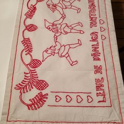 Röd bordslöpare med broderade tomtar och hjärtan. Perfekt för julbordet!