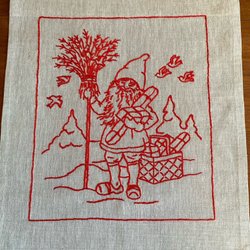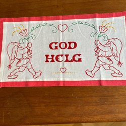 Charmig tryckt tygpåse med mått upptill 23,5 cm, uppifrån och ner 21,5 cm. Påsen är sydd av en tillvaratagen äldre tryckt duk, som får leva vidare på detta sätt. Motiv på båda sidorna av påsen. Motiven är tomtar med kälke dragen av en get, julgran facklor, gris mm. Fodrad med ljusgrönt tyg.
