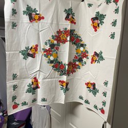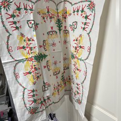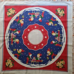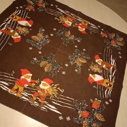 En söt retro julduk med tomtar, katter och harar. Perfekt för att skapa julstämning i hemmet.