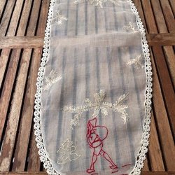 Röd jul duk i bomull. Vitt broderi med kedjestygn.