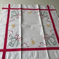En julbonad med broderi av texten ”God Jul”, blommor och julbjällror. Duken har en röd och grön kant. ( kantbandet något skadat i nederkant, se bild ) Man har använt någon form av blå märkpenna när man tillverkade bonaden, det blå är något synbart - se bild. Mått: 61,5 cm * 38,5 cm