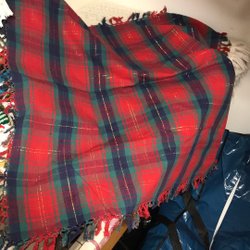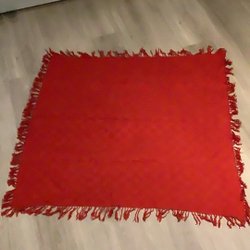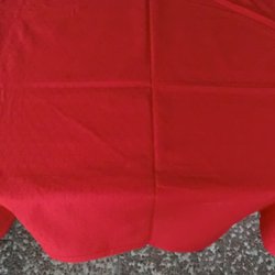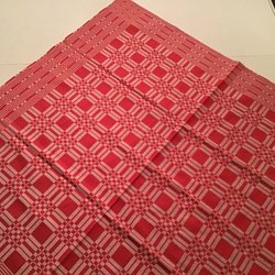 En röd julduk 150 x 200 cm (kommer med en liten klässbolduk) med ett diskret, vävt mönster av kvadrater. Tyget har en fin lyster och en jämn färgton.