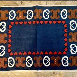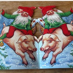 Julduk med ett motiv av tomtar. Röd, blå och vit färg. 22x22cm. I bästa skick. På baksidan finns en märkning som inte syns på framsidan. Se bild. Bomullstyg