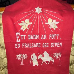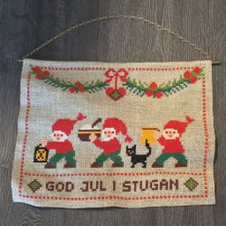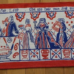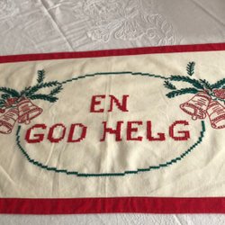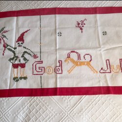 Bonden är handbroderad i korsstygn på räknelinne. Kantad med rött band med inslag av svart/vit rand.