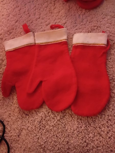 Tre röda grytlappar i form av vantar med vit kant och en tunn guldrand.Kan finnas nån fläck och hänge trasig på en