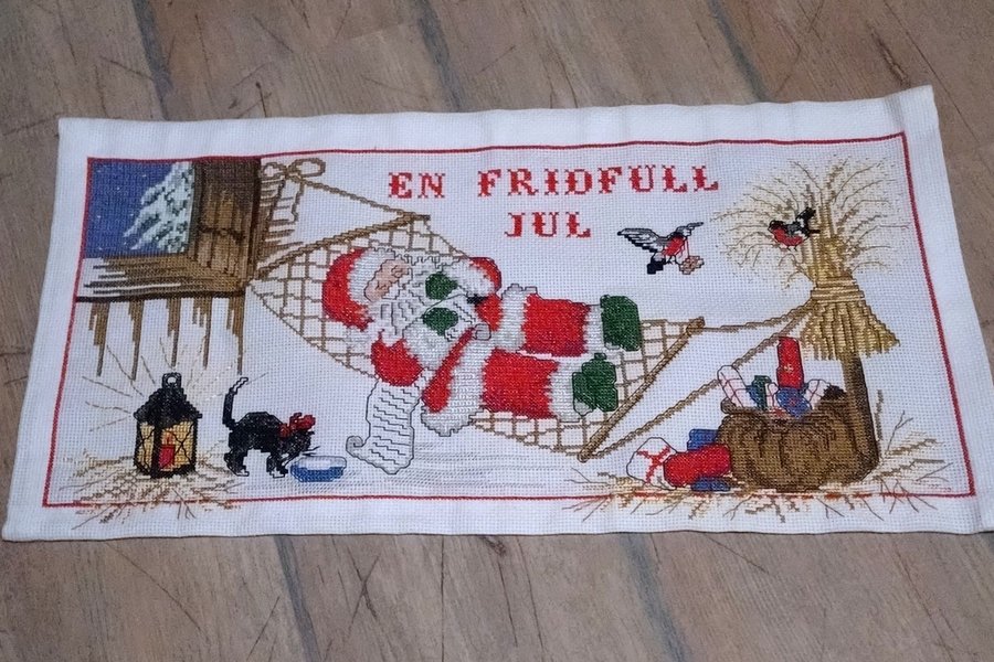 Broderad julbonad med motiv av en sovande tomte i en hängmatta. På bonaden står det "En fridfull jul". Mått 58 x 30 cm