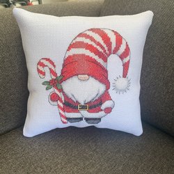 Håndsyet julepude med et håndbroderet motiv af en julemand med et glas vin. Den ene side er broderet, mens den anden side er rød. Str. 25x25 cm